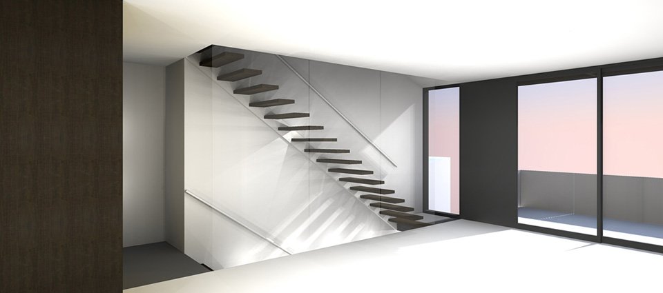 A dramatic cantilevered staircase provides an artisitic centerpiece to an open upper floor plan